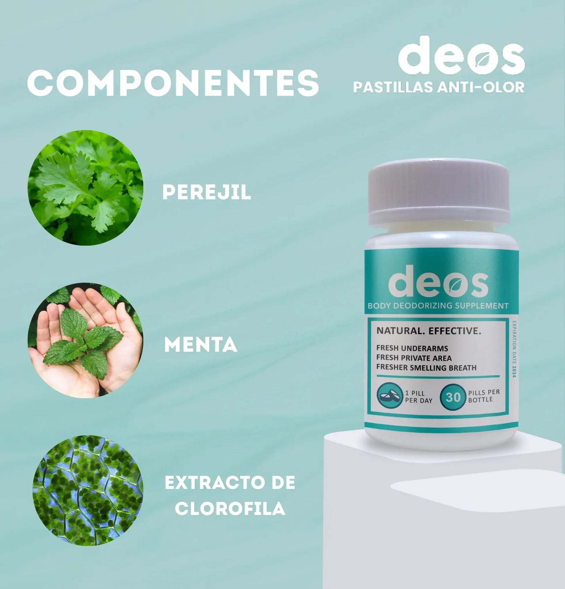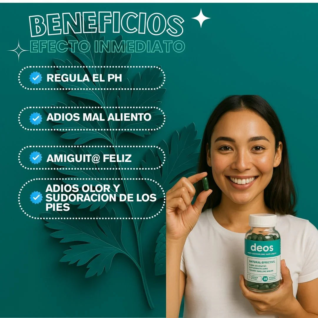 CON DEOS™ DISFRUTARÁS DE UNA PROTECCIÓN TOTAL CONTRA EL OLOR CORPORAL , UNA MEJOR SALUD INTESTINAL Y UNA PIEL MÁS CLARA, TODO CON UNA CÁPSULA DIARIA .